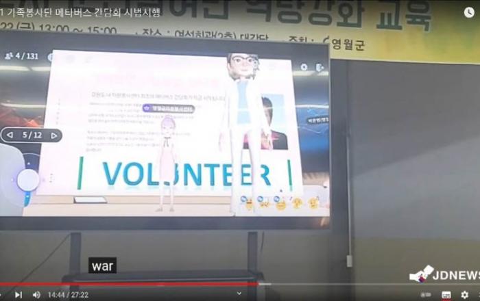 JD News 유소진기자 = 강원도 영월군자원봉사센터(센터장 심재섭)가 강원도 내 자원봉사센터 최초로 메타버스를 활용한 간담회를 개최하였다.본 메타버스 간담회는 영월군자원봉사센터의 2021년도 가족봉사단을 대상으로 진행되었던 플로깅 사업에 관한 활동 평가회로 지난 2
