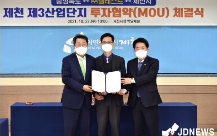 ▲ 제천시와 ㈜웰레스트가 제천 제3산업단지 투자협약을 27일에 체결했다.JD News 유소진 기자 = 충북 제천시가 오늘(27일) ㈜웰레스트와 165억원 규모의 제천 제3산업단지 공장신설 투자협약을 체결했다.이날 협약식에는 이상천 제천시장, 배동만 제천시의회 의장,