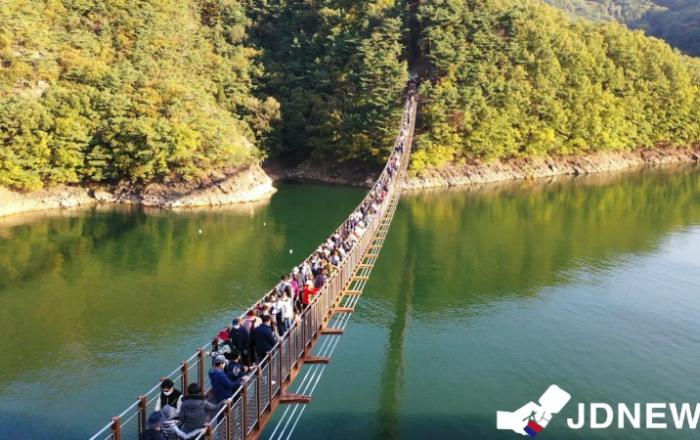 ▲ 주말(23일) 옥순봉 출렁다리의 방문객들로 인산인해를 이뤘다.JD News 유소진 기자 = 지난 10월 22일 개장한 충북 제천시 옥순봉 출렁다리에 주말 이틀간 3만1천명이 넘는 인파가 몰리며 새로운 관광명소의 탄생을 알렸다.26일 제천시에 따르면 지난 22일~24