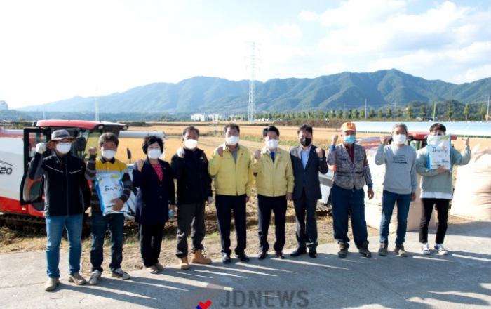 ▲ 의림지뜰 친환경 벼 추수현장을 찾아 격려했다.JD News 유소진 기자 = 충북 제천시 의림지 물을 이용하는 의림지뜰 친환경농업단지에서 벼 수확이 한창이다. 지난 20일에는 이상천 제천시장과 배동만 제천시의회 의장을 비롯하여 김병권 시의회 산업건설위원장