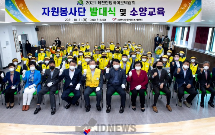 ▲ ‘2021 제천한방바이오박람회’ 자원봉사단 발대식 단체 사진 JD News 유소진 기자 = 충북 제천시는 오는 10월 27일부터 개최되는 ‘2021 제천한방바이오박람회’에서 활동하게 될 자원봉사자 발대식이 지난 21일 자원봉사센터 교육장에서 개최