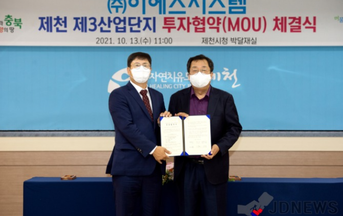 ▲ 제천시와 ㈜이에스시스템이 140억원 규모 제천 제3산업단지 공장신설 투자협약을 13일 체결했다.JD News 유소진 기자 = 충북 제천시는 ㈜이에스시스템과 140억원 규모의 제천 제3산업단지 공장신설 투자협약을 체결하며, 제3산업단지 분양에 가속도를 내고