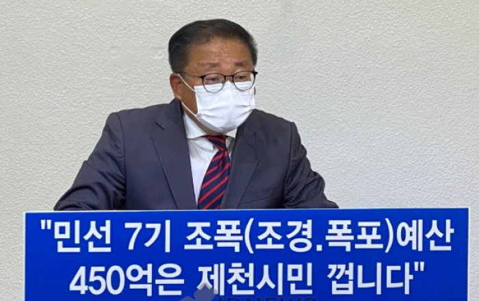 ▲ 13일 장인수가 제천시청 브리핑룸에서 오전 11시경 이상천 제천시장이 취임 후 조경과 폭포조성사업에 대한 과도한 예산 투입이었다고 주장하며 기자회견을 열었다.JD News 유소진 기자 = 민선 7기 이상천 제천시장이 취임 후 조경과 폭포 조성사업에 무려 450억원