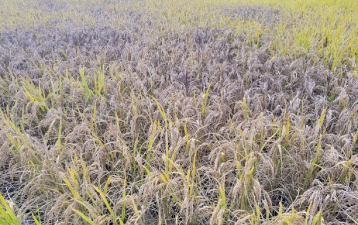 ▲ 제천시 봉양읍 공전리 일대 대부분 논이 깨씨무늬병이 확산되면서 죽어가고 있다. (사진=독자제공)JD News 유소진 기자 = 충북 제천시 봉얍읍 인근 벼 수확을 앞둔 논이 깨씨무늬병으로 온통 불그스름하게 물들어가고 있어 농민들이 시름에 빠졌다.3일 제천시 봉양읍 공