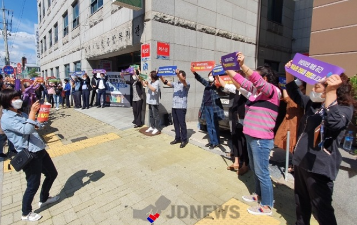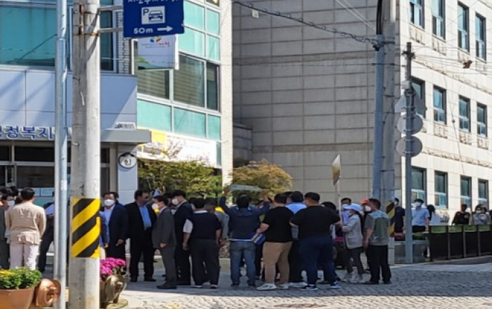 ▲ 24일 오전 10시 30분에 중앙동행정복지센터 앞에서 미술협회 회원들과 중앙동주민자치위원들이 미술관 건립에 대한 찬·반 갈등으로 몸싸움까지 벌어졌다. (사진 독자제공)JD News 유소진 기자 = 충북 제천시가 추진중인 제천시립미술관 건립 찬·반