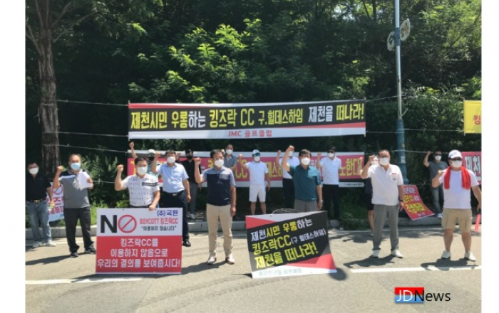 ▲ 킹스락 골프장CC(구 힐데스하임CC) 입구에서 시위하는 제천시골프협회원들 모습 JD News 유소진 기자 = 최근 한 방송사에서 보도된 '제천시 골프장 보복행정 의혹'과 관련해 제천시는 오늘(5일) 입장문을 통해 “사실이 아니다”라고 반박에 나섰다.5일 제천시는 입