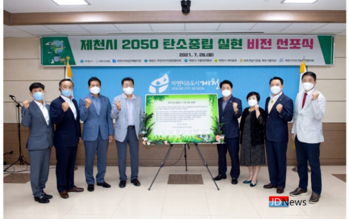 ▲ 제천시청 박달재실에서 지난 26일 '제천시 2050년 탄소중립 비전 선포식'을 개최했다.JD News 유소진 기자 = 제천시는 지난 26일 시청 박달재실에서 제천시의회, 시민단체가 참여한 가운데 2050년 탄소중립 실현을 위한 ‘제천시 2050년 탄소중립 비전 선포