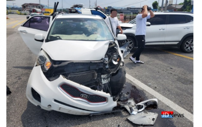 ▲ 제천 신백동 단양로 방면 모닝과 SUV차량이 충돌해 두 차량 모두 앞 범퍼가 크게 훼손됐다.JD News 유소진 기자 = 15일 오후 1시경 제천시 신백동 단양로 방면서 모닝과 SUV가 충돌해 운전자와 동승자 등 3명이 다쳐 병원으로 이송됐다.이날 발생한 충돌사고는