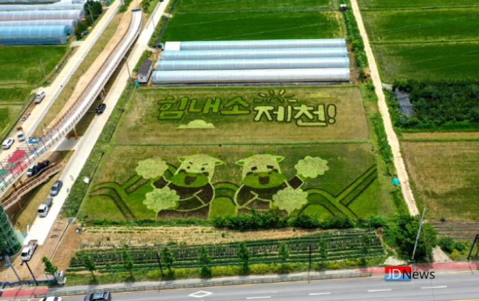 ▲ 제천시 의림지뜰 논그림 모습JD News 유소진 기자 = 제천시는 의림지와 도심을 잇는 에코브릿지(전망대형 육교)아래 오색벼로 수놓은 아름다운 논그림을 선보였다.6일 제천시에 따르면 지난 5월 23일 모산동 317번지 일원에 4,480㎡ 규모로 조성된 팜아