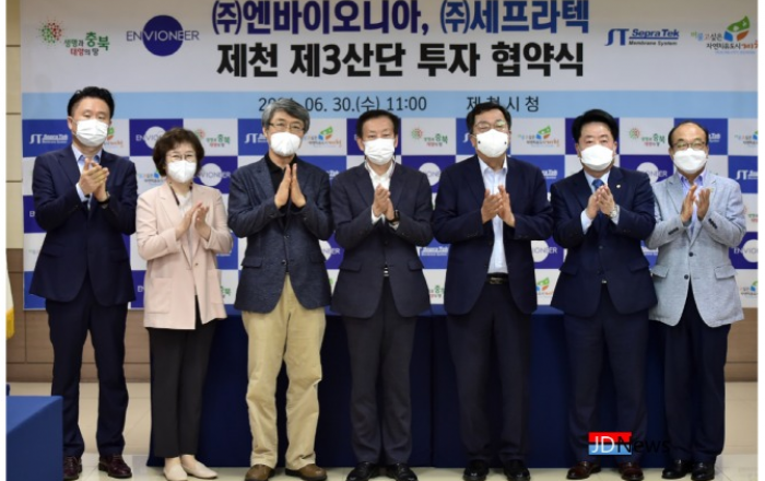 ▲ 제천시가 (주)엔바이오니아, (주)세프라텍 2개사와 제천공장 증설과 제천 3산업단지 신설 투자협약을 체결했다.JD News 유소진 기자 = 30일 제천시는 글로벌 강소기업으로 선정된 첨단소재 전문 기업인 ㈜엔바이오니아 및 그 자회사인 ㈜세프라텍과 제천 공장 증설과