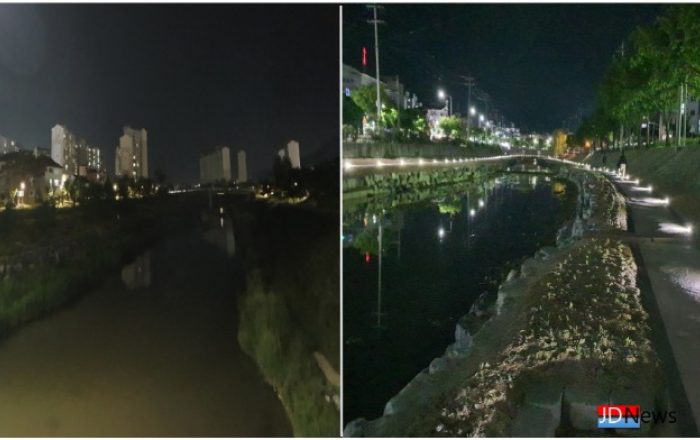 ▲ (왼쪽 장편천 오른쪽 하소천 모습) 두 하천의 야간모습으로 하소천은 야간산책이 가능하도록 조생됐고 장평천은 가로등이 없어 깜깜한 상태다. (사진 유소진기자 2021.6.3)JD News 유소진 기자 = 제천시가 친환경 생태공간 조성위해 하천사업을 시작했으나 외곽지역