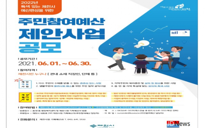 ▲ 제천시 주민참여예산 제안사업 공모 포스터JD News 유소진 기자 = 제천시는 2022년 특색 있는 주민참여예산 편성을 위한 주민제안사업을 공모한다고 31일 밝혔다. 공모는 내달 1일부터 30일까지 1개월 동안 제천시민 또는 지역내 근무하는 직장인(학생포함)이면