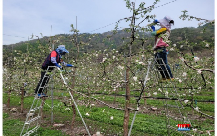 ▲ 제천시 봉양읍 사과농가 꽃 적화 작업 모습 JD News 유소진 기자 = 제천시가 신종 코로나바이러스 감염증(코로나19)장기화와 고령화에 따른 인력난을 해소하고 지역내 유휴 인력과 지역민의 일자리 제공을 위해 운영하고 있는 ‘제천시 농촌인력중개센터’가 큰