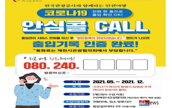 ▲ 제천시 관광지에 비치 된 '안심콜' 안내문 JD News 유소진 기자 = 제천시가 전화 한 통이면 간단히 출입기록을 등록하는 ‘방역 안심콜 출입관리 시스템’을 관광지까지 확대한다고 25일 밝혔다. 제천시 관광협의회(회장 김태권)는 지난 23일 지역내 모든