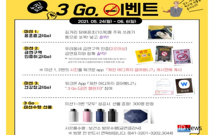 ▲ 제천시 보건소가 진행하는 '3 GO 이벤트' 포스터JD News 유소진 기자 = 제천시 보건소는 다가오는 31일 세계 금연의 날을 시민들에게 알리고, 금연 독려 및 지역내 금연구역 홍보를 위해 “3 GO 이벤트”를 진행한다고 25일 밝혔다.'3 GO' 이벤