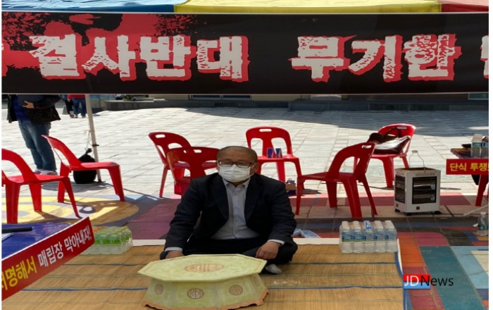 ▲ 더불어민주당 장인수 전 정책위 부의장은 제천 시민회관 앞에서 영월 쌍용C&E 폐기물매립장 조성 반대 무기한 단식농성 11일째로 투쟁 각오를 다지고 있다.JD News 유소진 기자 = 쌍용C&E(구 쌍용양회)의 폐기물매립장 조성 중단을 요구하며 11일째 제천 시민회관
