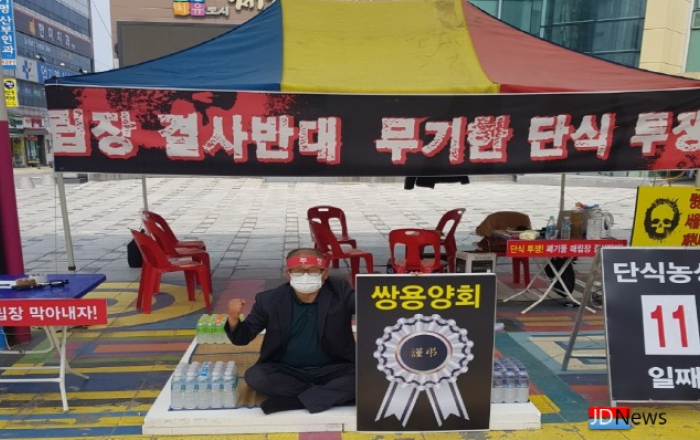 ▲ 제천 시민회관 앞에서 8일째 단식 농성 중인 민주당 장 전 부의장이 쌍용C&E 의혹을 제기했다.JD News 유소진 기자 = 쌍용C&E(구 쌍용양회)의 폐기물 매립장 조성을 반대하며 제천 시민회관 앞에서 8일째 단식 농성 중인 민주당 장인수 정책위 전 부의장은 "쌍