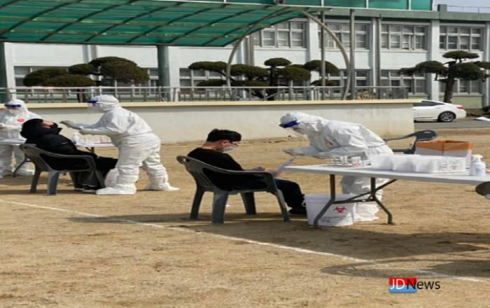 ▲ 제천시내 모중학교서 임시선별진료소가 마련돼 학생들이 코로나19 검체검사를 받고있다.JD News 유소진 기자 = 제천시에서 지난 원주사설합창단 관련 10대 여중생 1명(제천 362번)이 자가격리 해제 전 신종코로나바이러스 감염증(코로나19) 검체검사에서 양성판정을