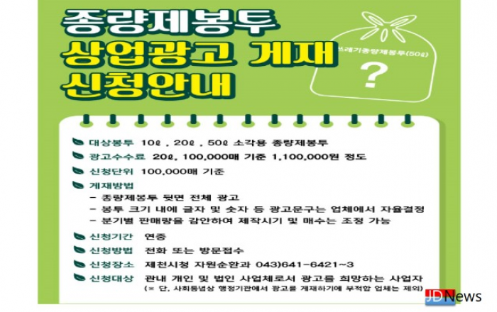 JD News 유소진 기자 = 제천시는 코로나19로 어려워진 지역 경제를 활성화 시키고 저렴한 광고료로 지역 기업을 홍보하기 위해 생활폐기물 종량제봉투 뒷면에 상업 광고를 게재한다.광고는 주민들이 가장 많이 사용하는 10리터, 20리터, 50리터 소각용 종량제