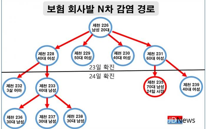 ▲ 코로나19 JD News 이용희 기자 = 충북 제천서 보험회사발 확진자 70대 남자 A(제천 235번)씨가 23일 사망했다.24일 제천시에 따르면 A씨(제천 235번)는 보험사에 다니는 60대 여성(제천 231번)의 남편으로 30대 딸(제천 239번)과 함