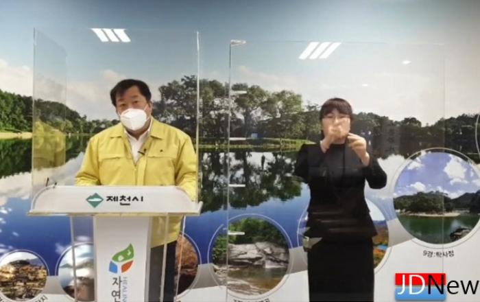 ▲ 제천시 8일 오전 브리핑 모습(제천=JD News) 이용희 기자 = 제천지역의 신종 코로나바이러스 감염증(코로나19) 확진자가 9명 추가 발생했다.확진자 9명중 6명은 자가격리 중 확진 판정을 받았고, 나머지 3명은 역학조사 진행 중이다.전날 진단검사자는 373명이