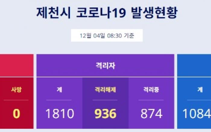▲ 제천시 코로나19 발생현황 오전 8:30 기준(제천=JD News) 이용희 기자 = 제천시는 신종 코로나바이러스 감염증(코로나19) 확진자 4명 발생했다고 전했다.확진자의 감염경로나 이동경로는 현재 역학조사 중으로 완료되는 대로 공개할 예정이다.