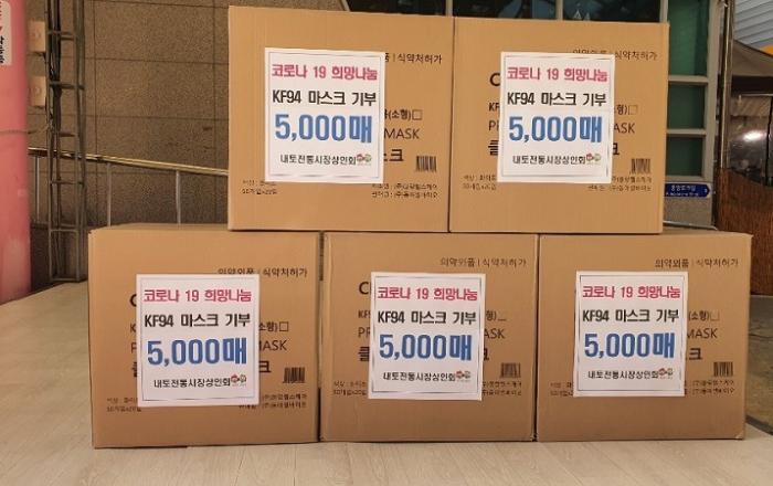 ▲ 내토전통시장상인회, 제천시에 마스크 5,000장 기탁 사진(제천=JD News) 이용희 기자 = 내토전통시장상인회(회장 김정문)가 최근 지역 내 코로나19 확산으로 어려움을 겪고 있는 제천 시민들을 위해 따뜻한 마음을 모았다. 지난 3일 내토전통시장상인회
