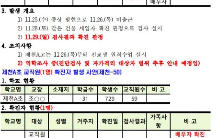 (제천=Jd News) 이용희 기자 = 제천지역의 신종 코로나바이러스 감염증(코로나19) 확진자가 속출하는 가운데 제천의 한 초등학교 교직원(시설 관리직) A씨가 확진을 받았다.또한 제천A고 손○○씨도 29일 확진 판정을 받으면서 교육당국에 비상이 걸
