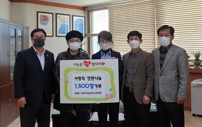 (제천=Jd News) 이용희 기자 = 중앙동주민자치위원회(위원장 지형일) 고문단은 지난 16일 연탄 1,500장을 중앙동행정복지센터에 기탁하였다. 이번에 후원된 연탄은 위 주민자치위원회 고문인 이운선, 방근식, 서동희, 박화자 위원과 지형일 위원장이 십시일반 모아