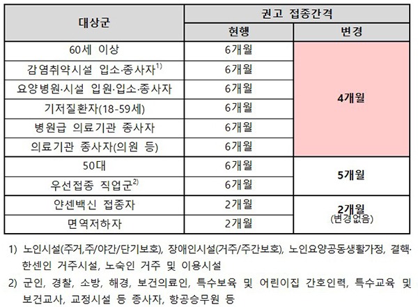 - 60세이상 고령, 감염취약시설 대상자, 의료 종사자 등 추가 접종 간격 4개월 단축
