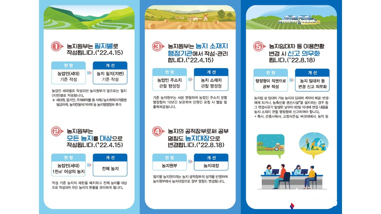 개편에 따른 주요 내용으로는 현행 세대 기준으로 작성하던 농지원부와 달리 토지대장 등 타 공부와 같이 필지별로 작성되며, 작성 대상도 현행 1000㎡이상 농지 면적 제한이 폐지되고 모든 농지로 확대된다.