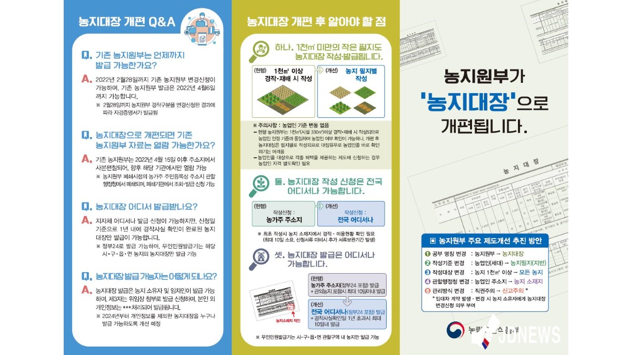 한편, 기존 농지원부는 농업인 주소지에 사본 편철돼 10년간 보관되고, 그 동안 농지원부에 등재됐던 농지는 필지별 농지대장으로 변경된다.