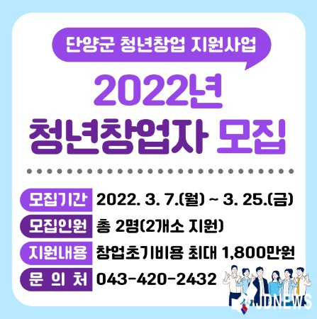 충북 단양군이 청년일자리 창출과 지역경제 활성화를 위해 2022년 청년창업 지원사업 ‘청년창업자’ 모집에 나섰다.