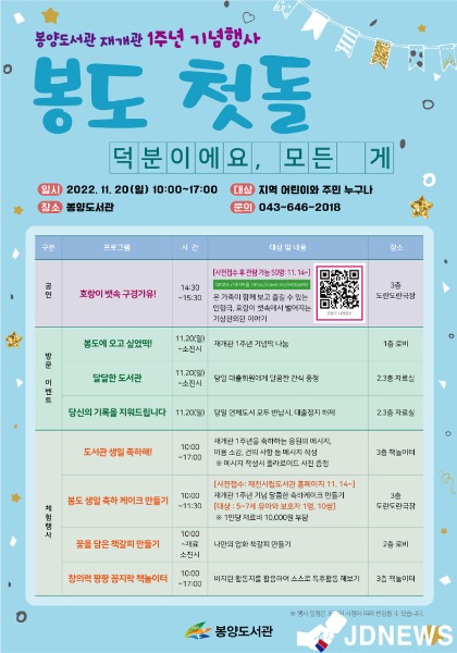 - 오는 20일 봉양도서관 재개관 1주년 기념 특별행사 진행