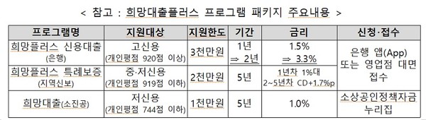 또 희망플러스 신용대출 지원대상은 현재 손실보전금 또는 방역지원금을 받은 고신용 소상공인인데, 영세 소상공인 이차보전 프로그램을 지원받은 소상공인도 포함해 지원한다.