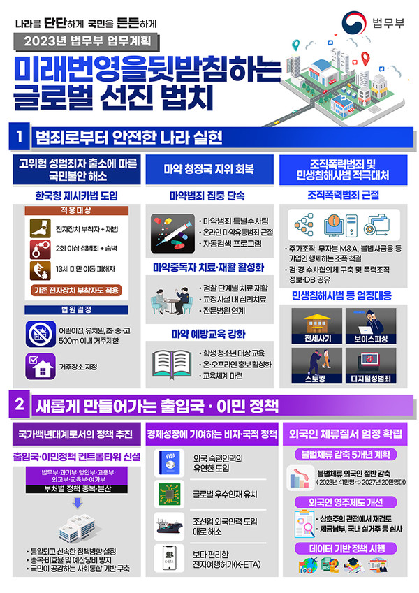 법무부는 ▲범죄로부터 안전한 나라 실현 ▲새롭게 만들어가는 출입국·이민 정책 ▲반법치행위 강력 대응으로 법질서 확립 ▲미래번영을 이끄는 법질서 인프라 구축 ▲사회 구석구석의 사각지대 인권보호 등 5대 핵심 추진과제를 통해 미래번영을 뒷받침하는 글로벌 선진 법치를 실현해 나간다.
