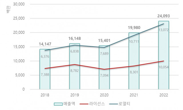2022년 실적 호조는 로열티 매출과 라이선스 매출이 함께 견인했다. 2021년 107억원이었던 로열티 매출은 22% 증가한 131억원, 83억원이었던 라이선스 매출은 21% 증가해 2022년에 최초로 100억원을 돌파했다. 2021년부터 연 100억을 넘어 안정적 궤도에 올라온 로열티 매출과 더불어 라이선스까지 100억원을 달성한 것이다.