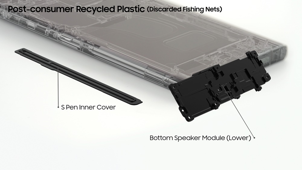 폐어망 재활용 소재를 20% 사용해 만든 재활용 플라스틱(PA: Polyamide)은 내부 S펜 커버, 하단 스피커 모듈 등에 적용됐다. 이를 통해 삼성전자는 2023년 한해 동안 약 15톤 이상의 폐어망을 수거하여 재활용하는데 기여할 수 있을 것으로 기대하고 있다.