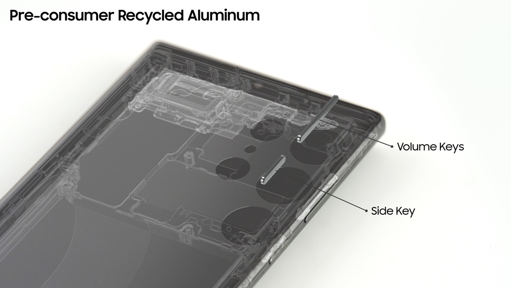 공정 중 발생하는 알루미늄 부산물(Pre-consumer)을 28% 사용해 만든 재활용 알루미늄은 제품 측면의 사이드키, 볼륨키, SIM 카드 트레이에 적용됐다.