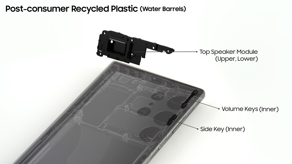 폐생수통 재활용 소재를 20% 사용해 만든 재활용 플라스틱(PC: Polycarbonates)은 상단∙하단 스피커 모듈, 사이드키, 볼륨키에 적용됐다.