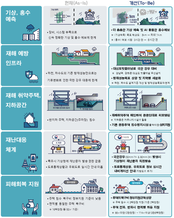 정부가 호우피해 방지를 위해 기상·홍수 예측 향상 등 5대 전략을 발표, ‘기후변화 대비 재난관리체계 개선 대책’을 본격 추진한다.