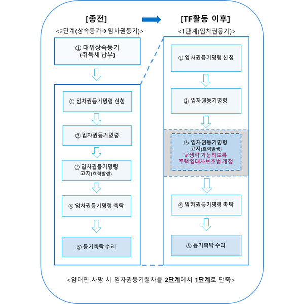 법무부는 대법원과 협력해 임대인이 사망한 경우 임차인이 대위상속등기를 선행하지 않고도 임차권등기명령에 따른 주택임차권등기가 가능토록 절차를 단축했다.