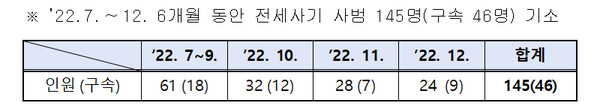 법무부는 그동안 전세사기 등 민생침해범죄에 대한 엄정히 대응해왔다. 이에 따라 지난해 7월부터 12월까지 6개월간 전세사기 사범 145명(구속 46명)이 기소됐다.