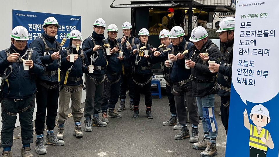 이번 ‘HEC心 Delivery’는 지난 2월 10일(금)을 시작으로 17일(금)까지 6일간 진행한다. 총 86개의 국내 현장에 간식차를 보내 약 12,500명의 현장 근무자들에게 샌드위치, 컵어묵 등의 간식과 응원 메시지를 전달한다.