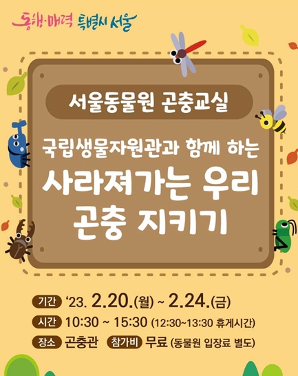 서울대공원은 봄 방학을 맞아, 2월 20일부터 24일까지 5일간 어린이와 가족 등 서울동물원을 찾은 관람객을 대상으로 사라져가는 곤충과 환경 보호의 필요성에 관한 교육을 진행한다.