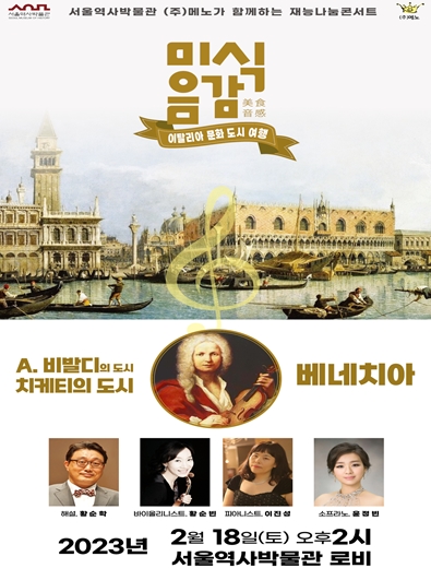 서울역사박물관은'미식음감(美食音感), 이탈리아 문화 도시 여행'이라는 테마로 2023년 재능나눔콘서트를 개최하며 ‘A.비발디의 도시 & 치케티의 도시 베네치아’를 주제로 2월 18일 오후 2시 박물관 로비에서 첫 연주회를 선보인다.