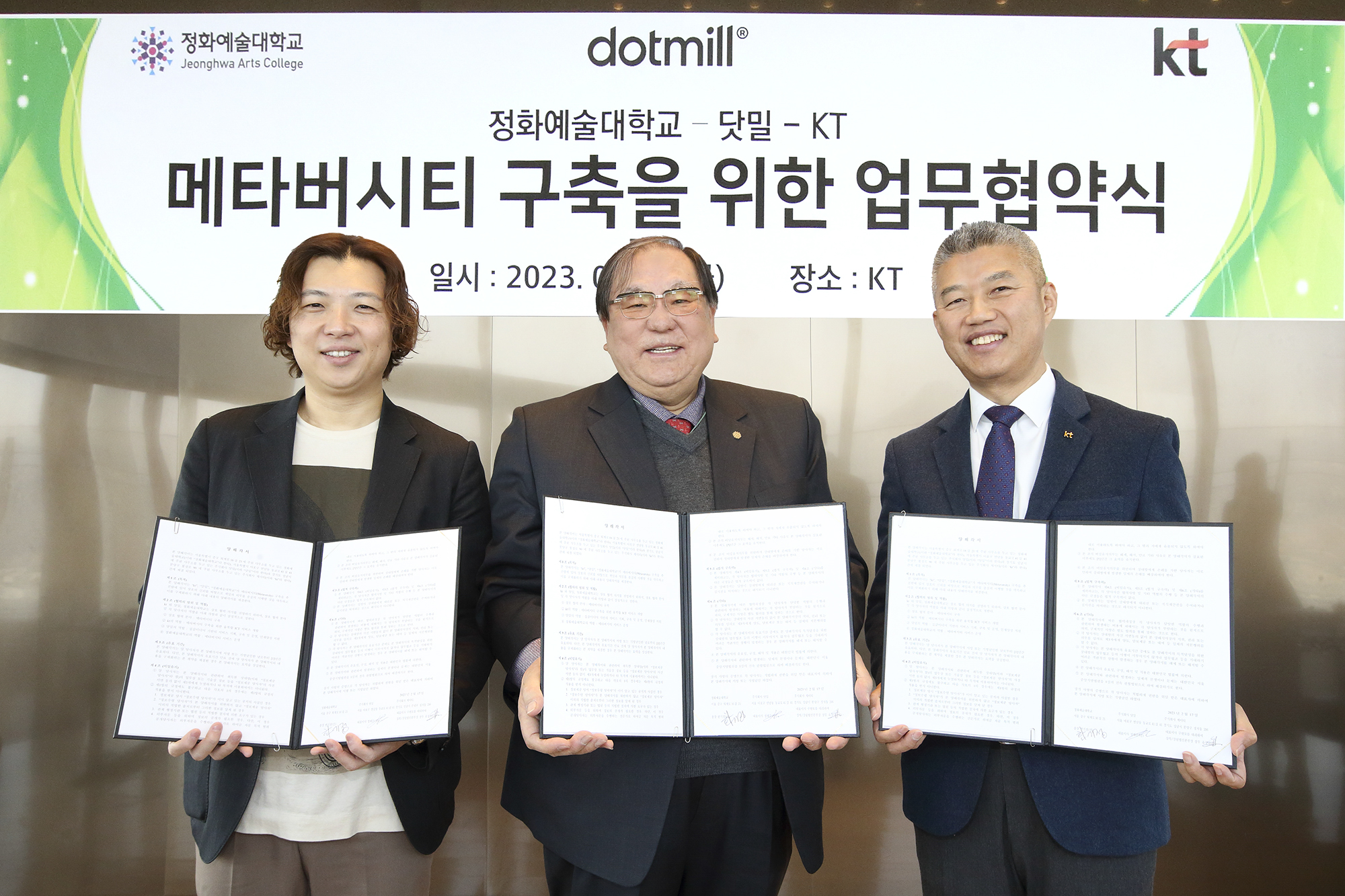 KT 강북강원광역본부가 실감 미디어 전문 업체 닷밀, 정화예술대학교와 함께 ‘메타버시티(Metaversity)’ 구축을 위한 업무협약을 체결했다고 20일 밝혔다.