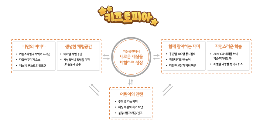 키즈토피아가 지향하는 목표는 ▶나의 개성을 나타낼 수 있는 나만의 아바타를 만들어 ▶테마별로 준비된 생생한 체험공간에서 ▶온라인 친구들과 함께 즐기는 것은 물론, ▶AI 친구들과 대화하고 퀴즈를 풀며 자연스럽게 학습하는 메타버스 세상이다.