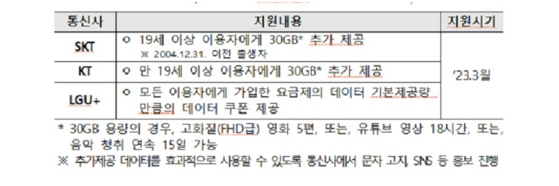 KT도 만 19세 이상 데이터 완전 무제한 요금제를 이용하지 않는 개인 고객(2월 28일 기준) 약 1000만명에게 별도 신청 절차 없이 3월 1일에 무료 데이터 30GB가 자동으로 제공된다. 제공되는 무료 데이터는 2023년 3월1일부터 31일까지 이용 가능하다.