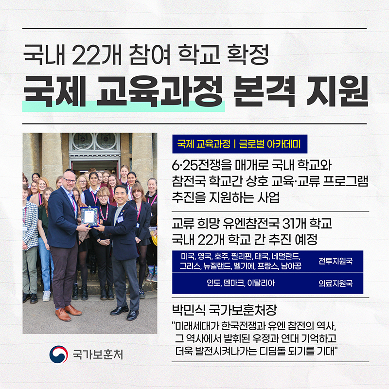 국가보훈처가 유엔참전국 국제 교육과정(글로벌 아카데미)에 참여할 국내 22개 학교를 선정해 미국·영국·호주 등 14개 유엔참전국 31개 학교 간 교류 활동을 본격 지원한다.